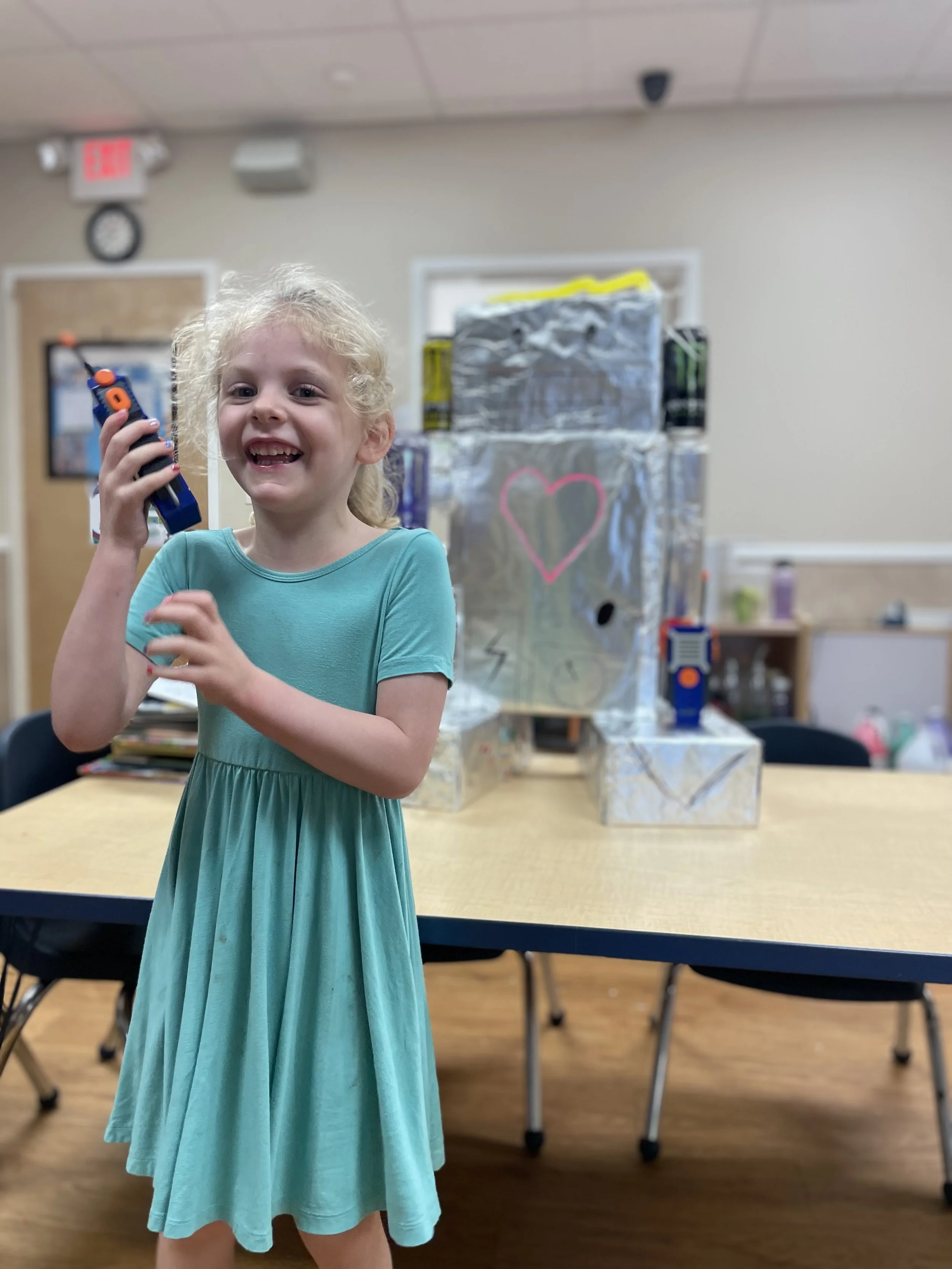 Our Green Frog classroom tinkered around their workshop and created their own robot! They tested supplies from all over their classroom to see what kind of model robot they could make! This was a fun center activity that used cause and effect, finding the right tools to use. When they were done building, they even got to talk to their robot! Little moments like this will last a lifetime and we are so happy we are able to be a part of it! Stay tuned for a video of the speaking robot!